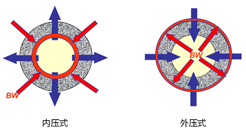 內(nèi)壓式膜的進水流道是中空纖維的內(nèi)腔,為防止堵塞,對進水的顆粒粒徑和含量都有較嚴格的限制,因而適合于原水水質(zhì)較好的工況。而且內(nèi)壓式則不能或者不建議采用氣擦洗方式,往往必須采用頻繁的化學(xué)加強反洗或化學(xué)清洗來緩解污染的問題。
