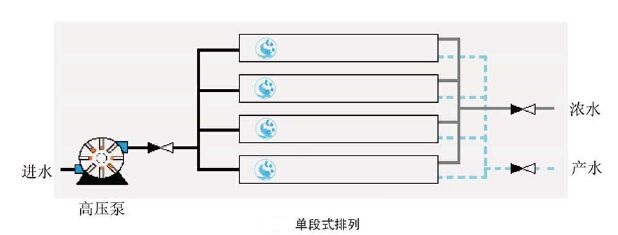 增加反滲透膜給水側的切向流速是降低反滲透污染的有效方法之一,在其他條件(產水量、回收率、膜通量)不變的情況下,切向流速的大小取決于排列方式。常規的水處理系統膜排列結構為多段排列,而在廢水回用時應采用濃水循環單段排列。采取濃水循環單段排列的方式,其目的是通過增大濃水流量,加大反滲透膜表面的切向流速,減緩污染物富集。采用多段排列設計時,一段反滲透濃水為二段反滲透進水,在含鹽量增加的同時,反而進水壓力降低、水量減少,污染的速度將大大加快。采用濃水循環單段排列設計,雖然原水與濃水混合后,反滲透進水總含鹽量上升,但由于增大了進水流量,每支反滲透膜的污染和負荷均等,降低系統壓差,增加物理性的沖刷效率,減少反滲透膜的污染和清洗次數,延長反滲透膜的使用壽命。