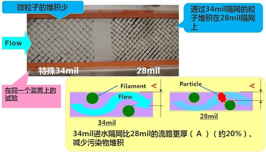 在眾多抗污染的機理中,反滲透膜元件給水流道的寬度已經是公認的膜元件抗污染性能的最重要指標,也是用戶在選擇產品時需要考慮的重點。進水流道越寬,系統對進水水質的要求和預處理設備不正常工況的要求相對來說越寬松。較寬的進水流道,可以更有效的進行膜清洗,即使在高污染條件下,系統仍可維持較低的壓降。但是進水隔網厚度增加時,由于進入膜元件給水的流量不變,導致給水在流道內流動的速度降低,加強了膜表面的濃差極化現象,進而使污染物更易在膜表面吸附。因此,進水隔網的厚度存在一個最優范圍,且隨膜元件不同的應用領域而不同,在線路板廢水回用中應選用流道寬度為34mil的反滲透膜元件。