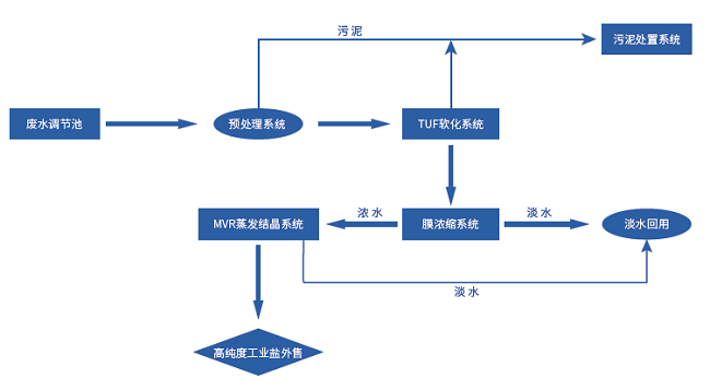 高濃度廢水零排放是指水經過重復使用后,將水中的含鹽量或污染物高濃縮(99%以上),水回收再利用,水中的鹽類和污染物經過濃縮結晶或壓濾廢渣以固體形式排出廠送垃圾處理廠填埋或將其回收作為有用的化工原料。